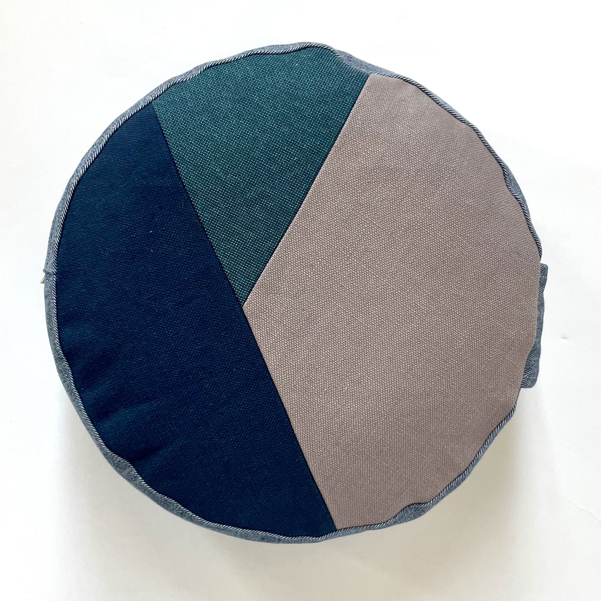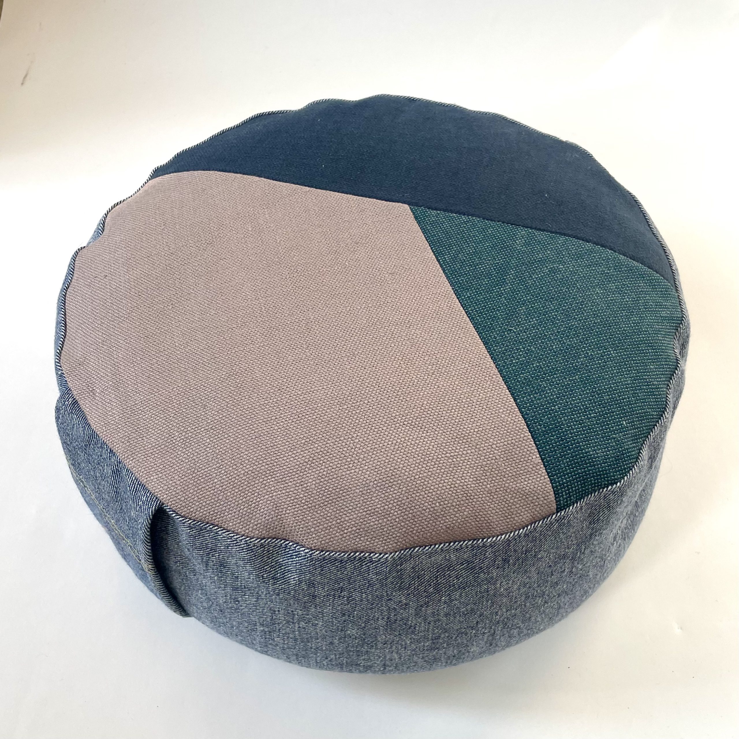 Made from upcycled denim and interior fabrics, inner bag is made from upcycled cotton and filled with organic buckwheat hulls.