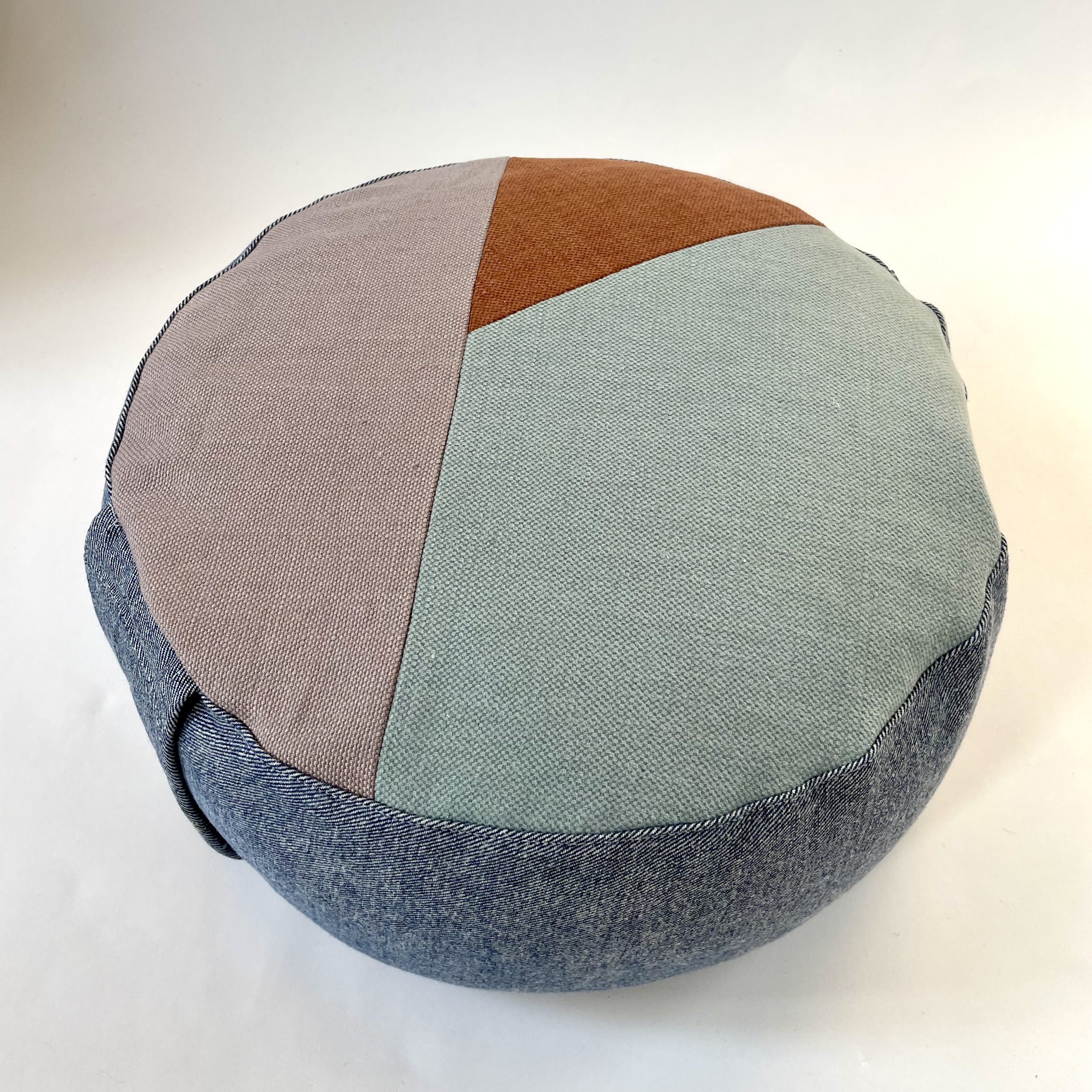 Made from upcycled denim and interior fabrics, inner bag is made from upcycled cotton and filled with organic buckwheat hulls.